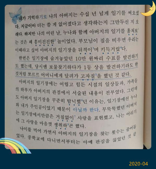 小時候,我以為日記的主人公是我和姐姐,而實際上爸爸才應該是日記的主人公。而且,日記中的爸爸看起來異常孤單疲憊。那個曾經偷看爸爸日記的兒子現在也已經30多歲了,每當我為生活而感到疲憊的時候,我都會想起爸爸的日記。